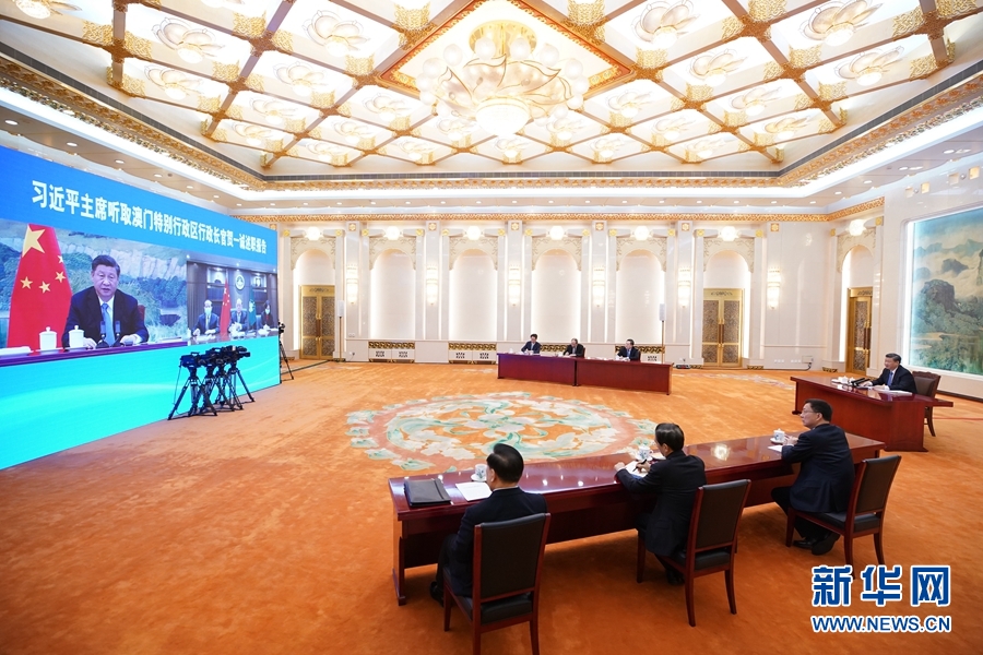 1月27日,國(guó)家主席習(xí)近平在北京以視頻連線(xiàn)方式聽(tīng)取了澳門(mén)特別行政區(qū)行政長(zhǎng)官賀一誠(chéng)2020年度的述職報(bào)告。新華社記者 鞠鵬 攝
