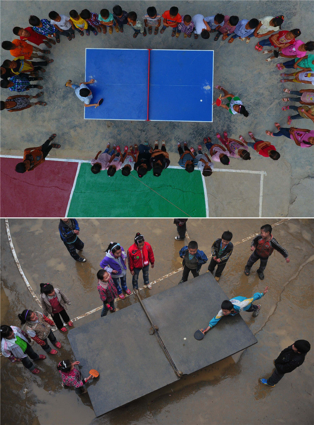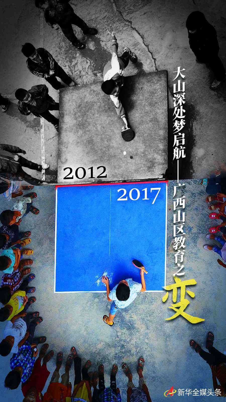 拼版照片:上圖為在廣西大化瑤族自治縣板升鄉(xiāng)弄勇小學(xué),孩子們?cè)诖蚱古仪颍?/span>201794日攝,無(wú)人機(jī)照片);下圖為在弄勇小學(xué),孩子們?cè)诖蚱古仪颍?/span>20121226日攝)。新華社記者 黃孝邦 攝