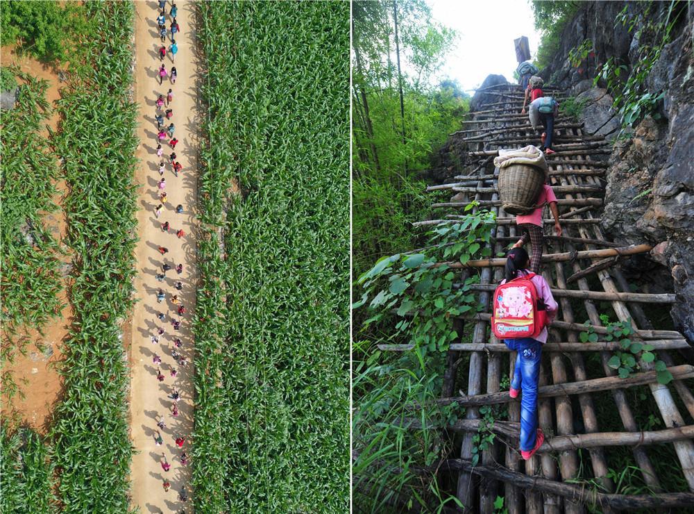 拼版照片:左圖為在廣西大化瑤族自治縣板升鄉(xiāng)弄勇村,孩子們走在放學(xué)路上(2019510日攝,無(wú)人機(jī)照片);右圖為在弄勇村弄頂屯,孩子們扛著生活用具,爬懸梯回家(201274日攝)。目前,弄勇村所有的屯都已告別沒(méi)有公路的歷史。新華社記者 黃孝邦 攝