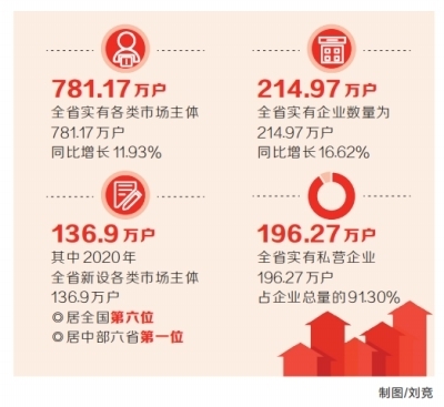 數(shù)據(jù)顯示,截至去年年底,全省實(shí)有各類(lèi)市場(chǎng)主體781.17萬(wàn)戶(hù),同比增長(zhǎng)11.93%。其中2020年全省新設(shè)各類(lèi)市場(chǎng)主體136.9萬(wàn)戶(hù),居全國(guó)第6位、中部六省第1位。