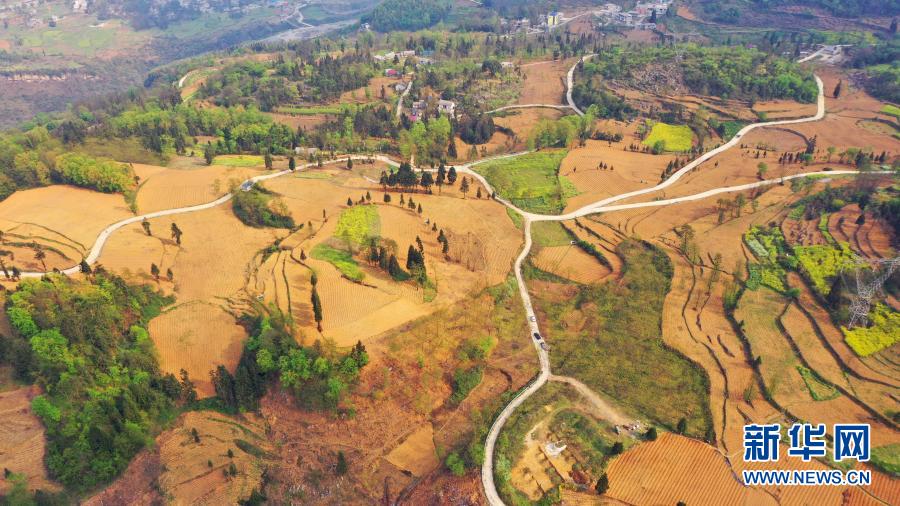 貴州省六枝特區(qū)大箐村的產(chǎn)業(yè)路四通八達(dá),這里是倪裔豹駐村的“最后一崗”(2020年3月24日攝,無(wú)人機(jī)照片)。新華社記者 劉勤兵 攝