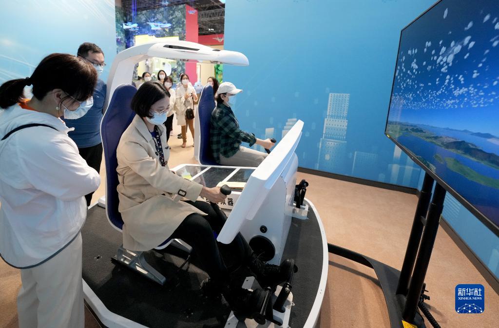 10月7日,觀眾在“奮進(jìn)新時(shí)代”主題成就展上體驗(yàn)操縱直升機(jī)訓(xùn)練模擬器。當(dāng)日是國(guó)慶長(zhǎng)假的最后一天,大批觀眾來到北京展覽館參觀“奮進(jìn)新時(shí)代”主題成就展。新華社記者 王毓國(guó) 攝