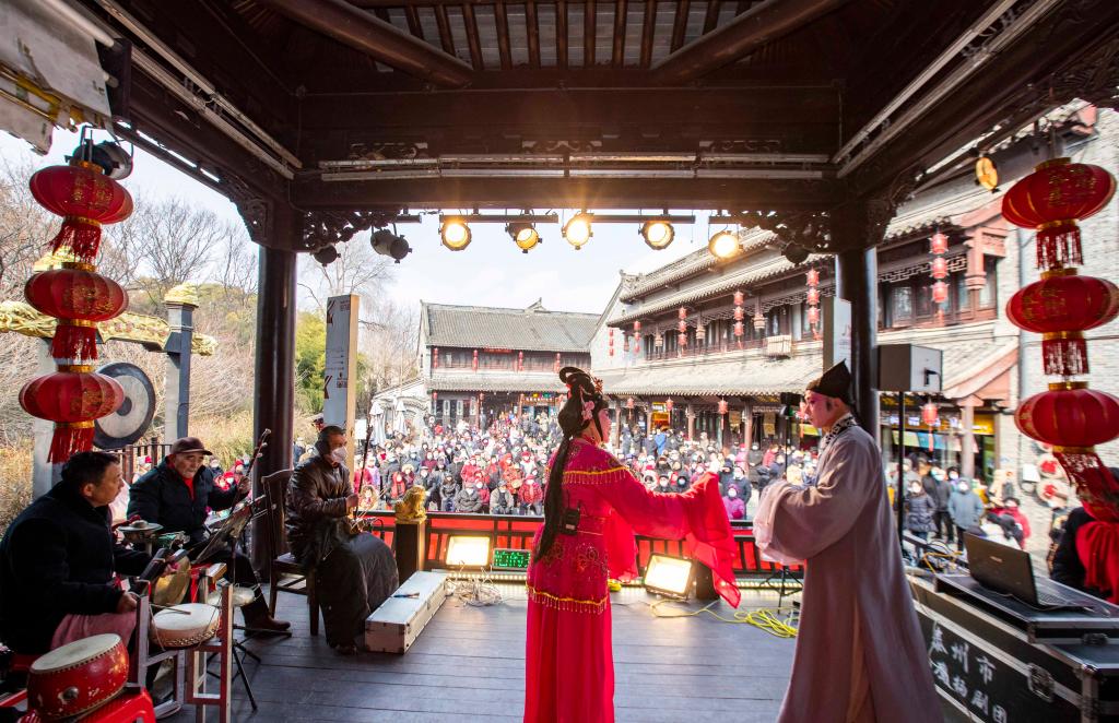 1月24日,江蘇省泰州市海陵區(qū)小鷹揚劇團在泰州老街古戲臺表演揚劇《珍珠塔·贈塔》選段。新華社發(fā)(湯德宏 攝)