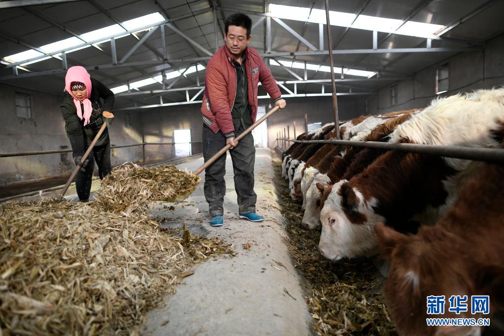 寧夏吳忠市同心縣河西鎮(zhèn)旱天嶺村村民馬國(guó)才(右)、馬婷夫婦在村里的養(yǎng)牛合作社喂牛(2017年12月21日攝)。新華社記者 王鵬 攝