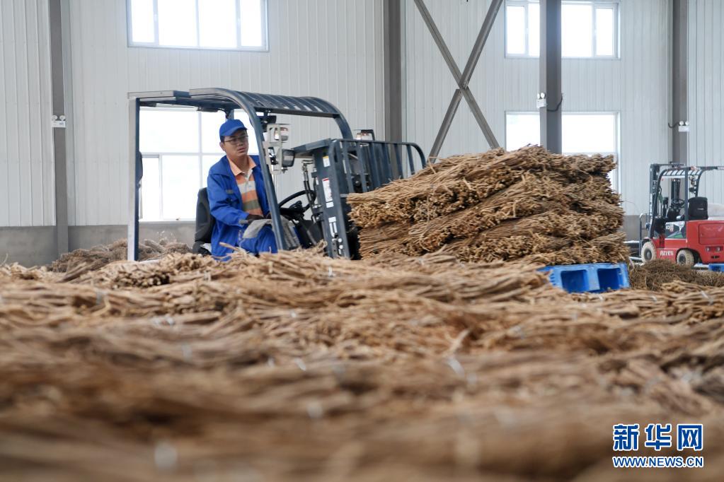 在甘肅省隴南市宕昌縣哈達(dá)鋪琦昆現(xiàn)代中藥材倉(cāng)儲(chǔ)物流基地,工作人員使用叉車搬運(yùn)中藥材(2020年9月18日攝)。新華社記者 范培珅 攝