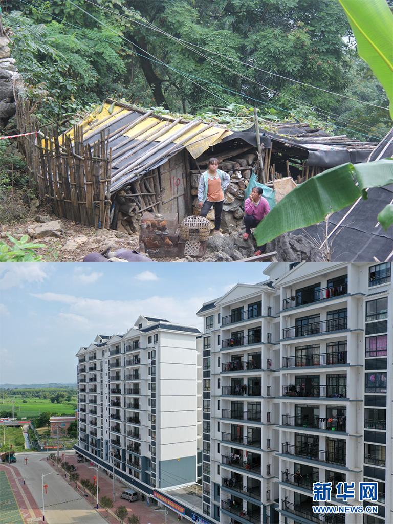 這是一張拼版照片,上圖為:2018年11月11日在廣西田東縣思林鎮(zhèn)龍邦村拍攝的村民和自家簡(jiǎn)陋的房屋(思林鎮(zhèn)政府供圖);下圖為:2019年8月28日拍攝的當(dāng)?shù)貫辇埌畲逍陆ǖ奈挥谔飽|縣思林鎮(zhèn)的易地扶貧搬遷安置點(diǎn)(無(wú)人機(jī)照片,新華社記者曹祎銘攝)。新華社發(fā)