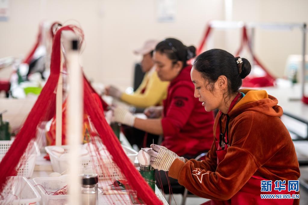 在云南省怒江傈僳族自治州福貢縣匹河鄉(xiāng)托坪村搬遷安置點(diǎn),搬遷群眾在扶貧車間縫制棒球(2020年11月2日攝)。新華社記者 胡超 攝