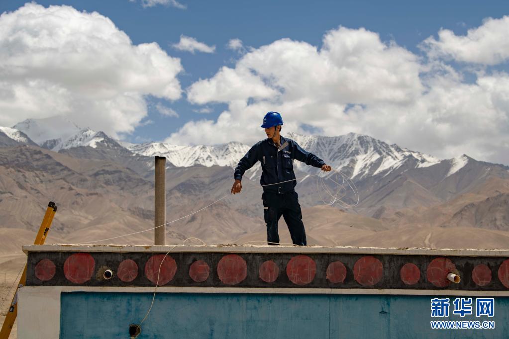 在新疆喀什地區(qū)塔什庫(kù)爾干塔吉克自治縣,工作人員為當(dāng)?shù)剞r(nóng)戶鋪設(shè)入戶光纖(2020年6月10日攝)。新華社記者 胡虎虎 攝