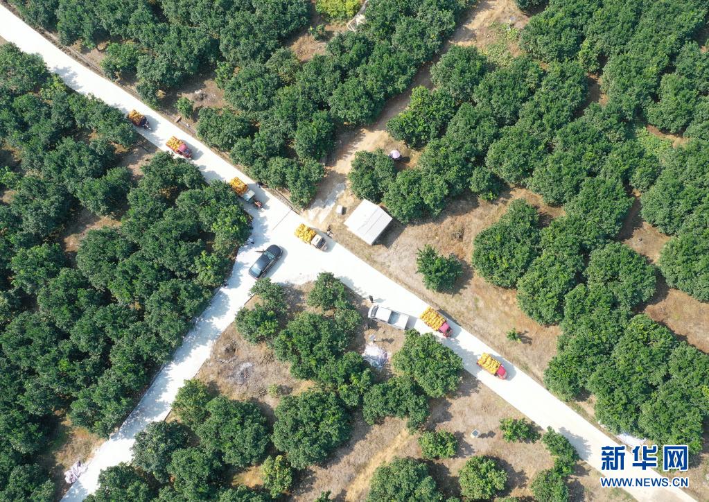 在廣西羅城仫佬族自治縣金玉柚生態(tài)產(chǎn)業(yè)扶貧示范區(qū),裝載柚子的車輛在柚子園內(nèi)行駛(2019年11月5日攝,無(wú)人機(jī)照片)。新華社記者 陸波岸 攝