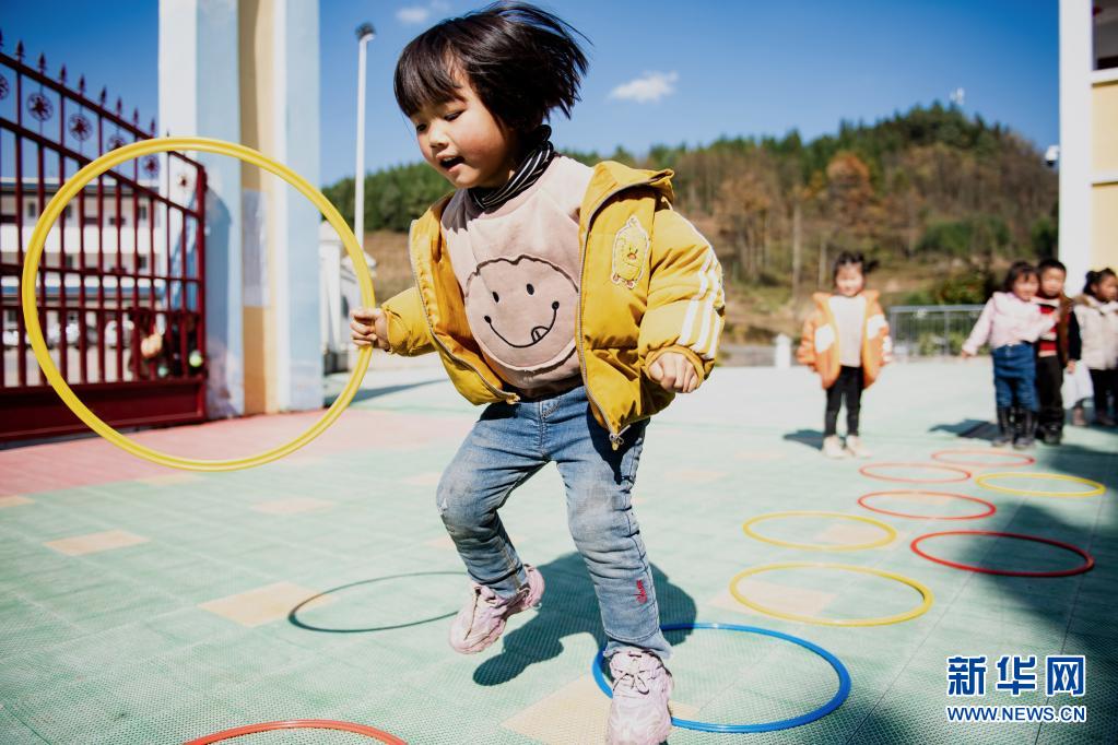 云南省鎮(zhèn)雄縣以古鎮(zhèn)巖洞腳村幼兒園的孩子在操場(chǎng)上玩耍(2020年11月11日攝)。新華社記者 王冠森 攝