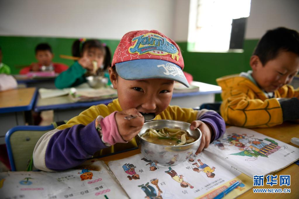 寧夏西吉縣震湖鄉(xiāng)陳岔小學(xué)的孩子在教室吃午餐,學(xué)生每天在學(xué)校有兩頓國(guó)家提供補(bǔ)助的營(yíng)養(yǎng)餐(2017年6月14日攝)。新華社記者 王鵬 攝
