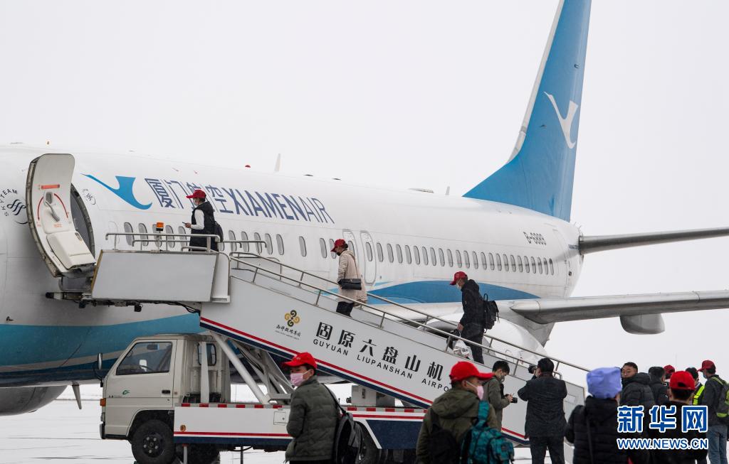 在寧夏固原六盤山機(jī)場(chǎng),固原市原州區(qū)、西吉縣的務(wù)工人員乘包機(jī)前往福建(2020年2月27日攝)。新華社記者 馮開華 攝