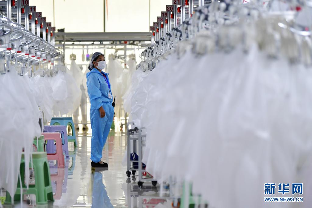 在甘肅臨夏回族自治州積石山縣,依托東西部扶貧協(xié)作平臺(tái)引進(jìn)的服裝加工企業(yè)甘肅拓奇扶貧車間的員工在服裝加工生產(chǎn)線上作業(yè)(2020年8月9日攝)。新華社記者 陳斌 攝