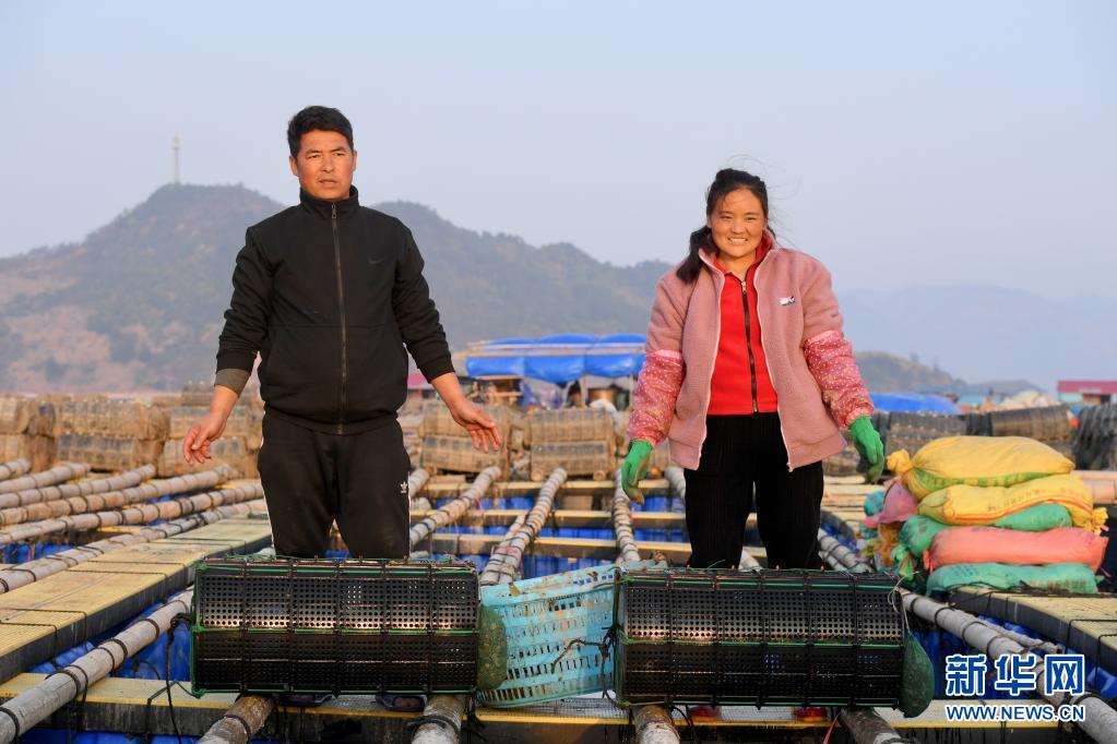 “春運(yùn)母親”巴木玉布木與丈夫巫其石且從四川涼山彝族自治州老家輾轉(zhuǎn)來(lái)到福建省霞浦縣溪南鎮(zhèn)海域,從事海上漁排海參養(yǎng)殖。這是2月4日在漁排上拍攝的巴木玉布木(右)與丈夫巫其石且。新華社記者 姜克紅 攝