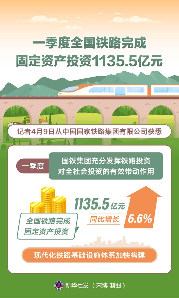 ??    新華社北京4月9日電(記者樊曦)記者9日從中國國家鐵路集團(tuán)有限公司獲悉,一季度,國鐵集團(tuán)充分發(fā)揮鐵路投資對全社會(huì)投資的有效帶動(dòng)作用,全國鐵路完成固定資產(chǎn)投資1135.5億元、同比增長6.6%,現(xiàn)代化鐵路基礎(chǔ)設(shè)施體系加快構(gòu)建。