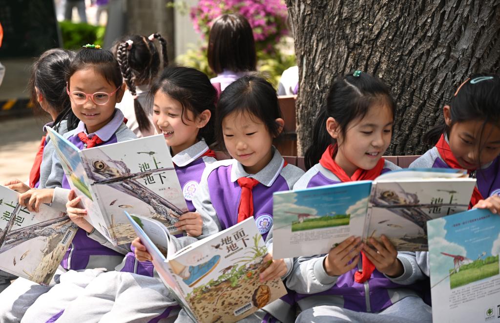 在她的校園里,有一棵“長(zhǎng)滿書的大樹(shù)”,掛滿了《神筆馬良》《西游記》《可愛(ài)的中國(guó)》等經(jīng)典書籍。教學(xué)樓走廊里、教室里,隨處可見(jiàn)各種圖書。踏著閱讀的階梯,祖國(guó)的花朵茁壯成長(zhǎng)。