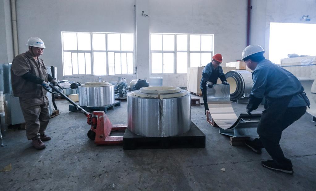 5月2日,在位于浙江省嘉興市秀洲區(qū)王店鎮(zhèn)的浙江振申絕熱科技股份有限公司聚氨酯車(chē)間內(nèi),工人進(jìn)行管托安裝工序。新華社記者 徐昱 攝