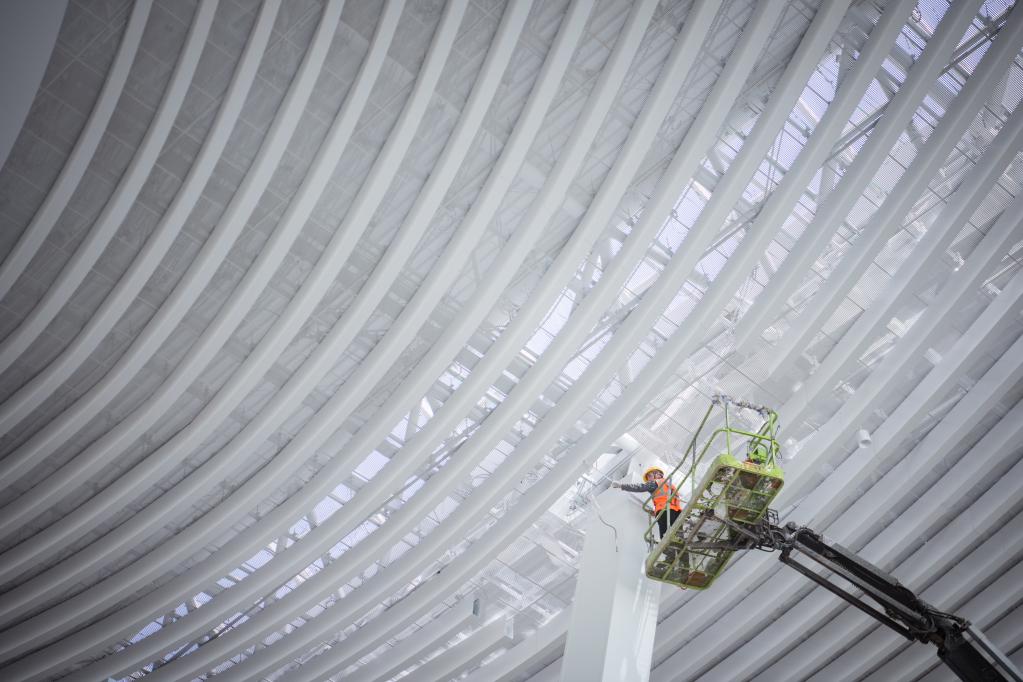5月1日,在中建三局承建的武漢天河機(jī)場(chǎng)T2航站樓改造工程項(xiàng)目工地,工人檢查吊頂內(nèi)管線(xiàn)。新華社記者 伍志尊 攝