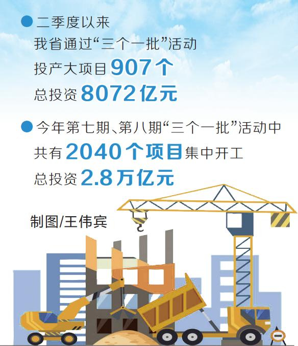 省發(fā)展改革委相關(guān)負責(zé)人介紹,今年以來,我省以拼搶之姿推動一批含新量、含金量、含綠量較高的重大項目開工建設(shè),今年第七期、第八期“三個一批”活動中,共有2040個項目集中開工,總投資2.8萬億元,掀起了新一輪建設(shè)高潮。