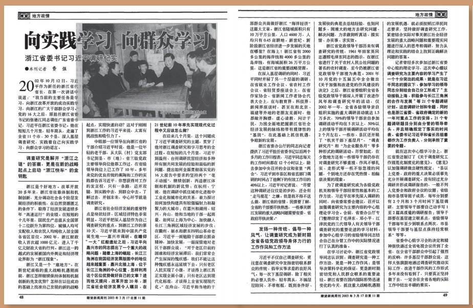 20033月,第10期、第11期《瞭望》連續(xù)刊發(fā)費(fèi)強(qiáng)采寫的深度報(bào)道《浙江省委書記習(xí)近平:雙輪驅(qū)動(dòng)提速發(fā)展》《向?qū)嵺`學(xué)習(xí)?向群眾學(xué)習(xí)——浙江省委書記習(xí)近平調(diào)研紀(jì)實(shí)》。4個(gè)月后,浙江省委十一屆四次全會(huì)提出了面向未來要進(jìn)一步發(fā)揮八個(gè)方面的優(yōu)勢(shì)、推進(jìn)八個(gè)方面的舉措,即八八戰(zhàn)略。其中的諸多提法,在《瞭望》的上述報(bào)道中已現(xiàn)雛形。