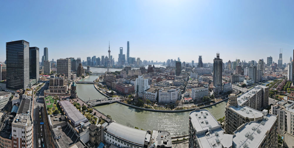 空中俯瞰蘇州河與黃浦江交匯處(2023年3月3日攝)。新華社記者 方喆 攝