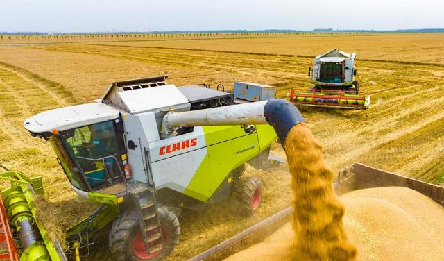 6月7日,在河南駐馬店西平縣老王坡高標(biāo)準(zhǔn)農(nóng)田,收割機(jī)將剛收獲的小麥裝車。全國人吃的每27個(gè)便頭中,就有一個(gè)來自駐馬店。新華社發(fā)(趙永濤攝)