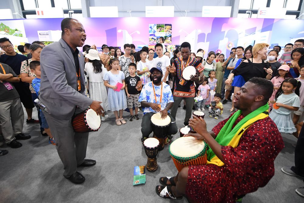 9月2日,在“一帶一路”沿線國(guó)家特色文化展示活動(dòng)上,加納共和國(guó)駐華大使館展區(qū)的工作人員在現(xiàn)場(chǎng)即興表演。新華社記者 鞠煥宗 攝