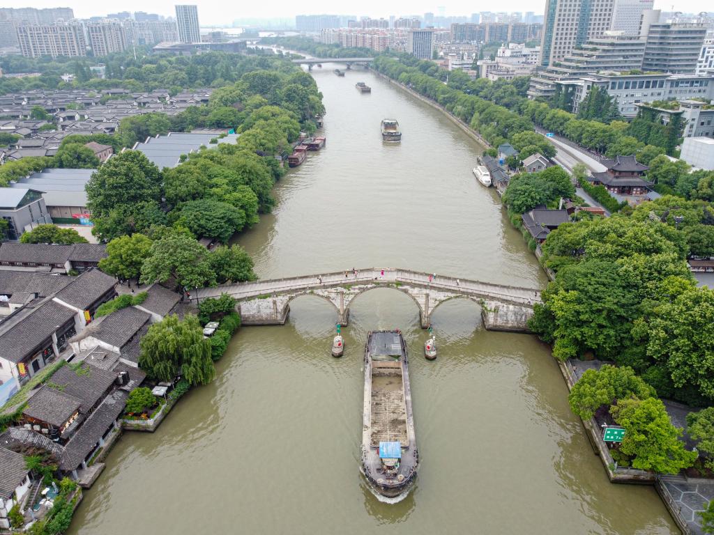 2022年5月27日,貨船通過京杭大運(yùn)河杭州段拱宸橋。(新華社記者江漢 攝)