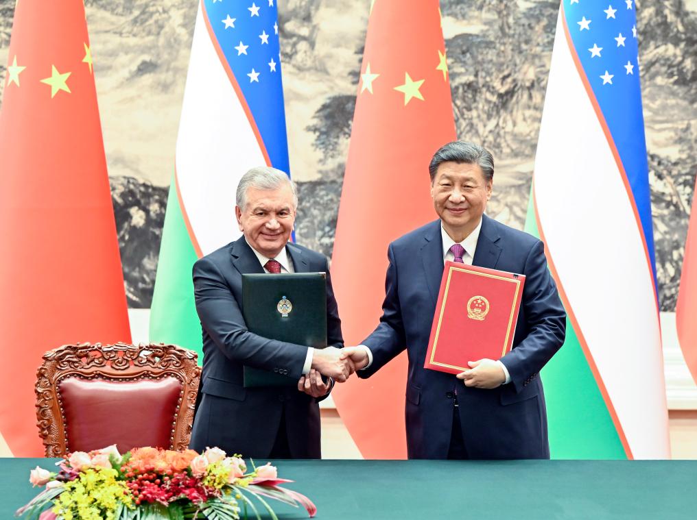 ??1月24日下午,國家主席習(xí)近平在北京人民大會(huì)堂同烏茲別克斯坦總統(tǒng)米爾濟(jì)約耶夫舉行會(huì)談。會(huì)談后,兩國元首簽署并發(fā)表了《中華人民共和國和烏茲別克斯坦共和國關(guān)于新時(shí)代全天候全面戰(zhàn)略伙伴關(guān)系的聯(lián)合聲明》。