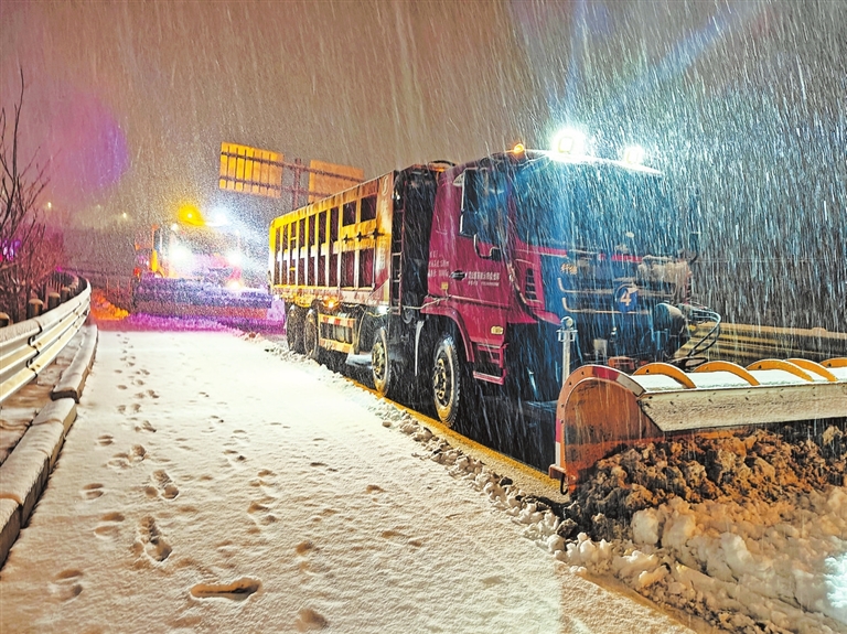 1月31日下午,我省迎來今年首場大范圍雨雪。河南交投集團全力清理積雪,保障高速大通道安全暢通,守護春運期間群眾的美好歸鄉(xiāng)路。圖為工作人員駕駛除雪車行駛在連霍高速鄭州段。陳曉娟 攝