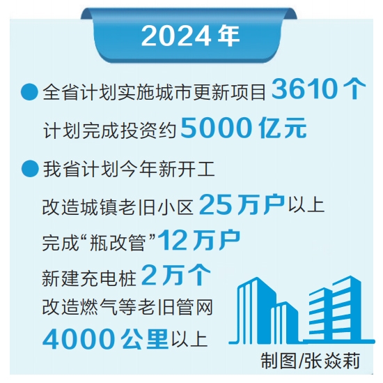 聚焦群眾“急難愁盼”等突出問(wèn)題,我省堅(jiān)持項(xiàng)目為王,科學(xué)謀劃實(shí)施城市更新項(xiàng)目。針對(duì)“一主兩副”重點(diǎn)城市和城市生命線安全工程、老舊小區(qū)改造、地下管網(wǎng)改造等重點(diǎn)領(lǐng)域,完善城市更新項(xiàng)目庫(kù),強(qiáng)化項(xiàng)目監(jiān)測(cè)調(diào)度,穩(wěn)步推動(dòng)項(xiàng)目落地見(jiàn)效。我省計(jì)劃今年新開(kāi)工改造城鎮(zhèn)老舊小區(qū)25萬(wàn)戶以上、完成“瓶改管”12萬(wàn)戶、新建充電樁2萬(wàn)個(gè),改造燃?xì)獾壤吓f管網(wǎng)4000公里以上。