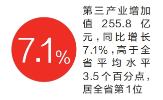 ??分產(chǎn)業(yè)看,三次產(chǎn)業(yè)增加值增速全面領先。第一產(chǎn)業(yè)增加值18.4億元,同比增長2.9%,高于全省平均水平0.3個百分點,居全省第4位;第二產(chǎn)業(yè)增加值189.2億元,同比增長11.7%,高于全省平均水平5個百分點,居全省第2位;第三產(chǎn)業(yè)增加值255.8億元,同比增長7.1%,高于全省平均水平3.5個百分點,居全省第1位。(記者 李宗寬)