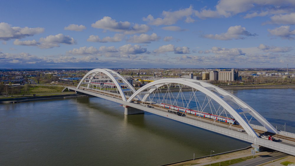 ??2024年3月12日,一列火車運行在匈塞鐵路塞爾維亞境內貝諾段諾維薩德多瑙河大橋上(無人機照片)。新華社發(fā)(任衛(wèi)云攝)
