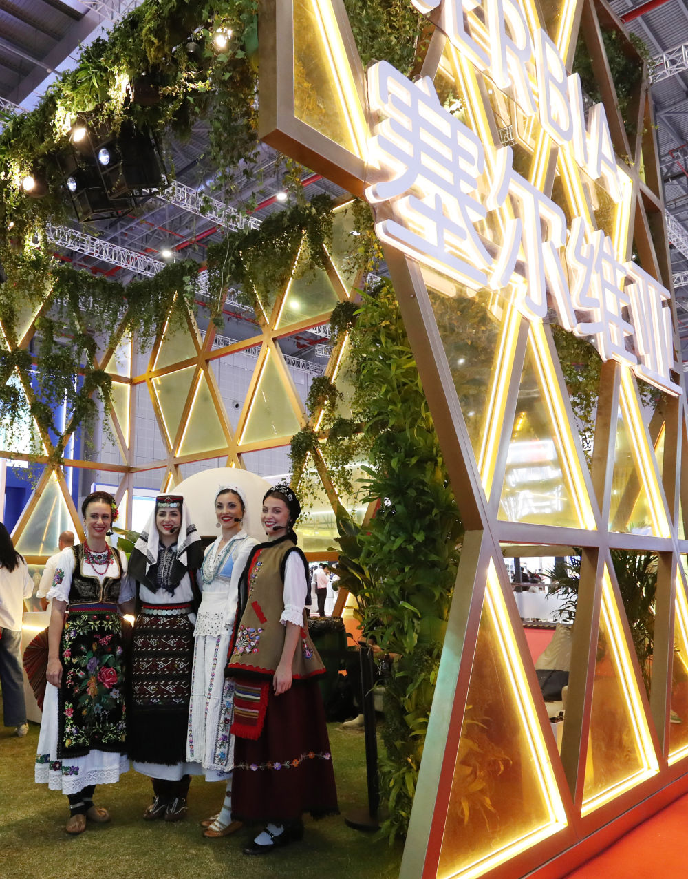 ??2023年11月6日,身著傳統服飾的演職人員在上海進博會國家展塞爾維亞展臺迎接參觀者。第六屆進博會國家展全面恢復線下舉辦,洪都拉斯、塞爾維亞、越南、南非、哈薩克斯坦作為本屆進博會主賓國在國家展亮相。新華社記者 方喆 攝