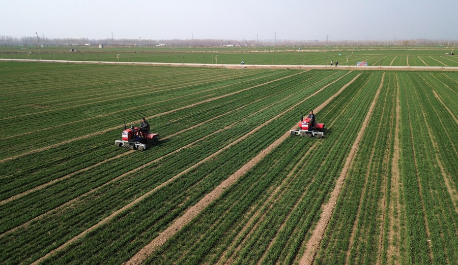 ??山東省汶上縣,農(nóng)民駕駛農(nóng)機(jī)在高標(biāo)準(zhǔn)農(nóng)田里進(jìn)行小麥春季管護(hù)作業(yè)(2024年3月13日攝,無人機(jī)照片)。新華社記者 徐速繪 攝
