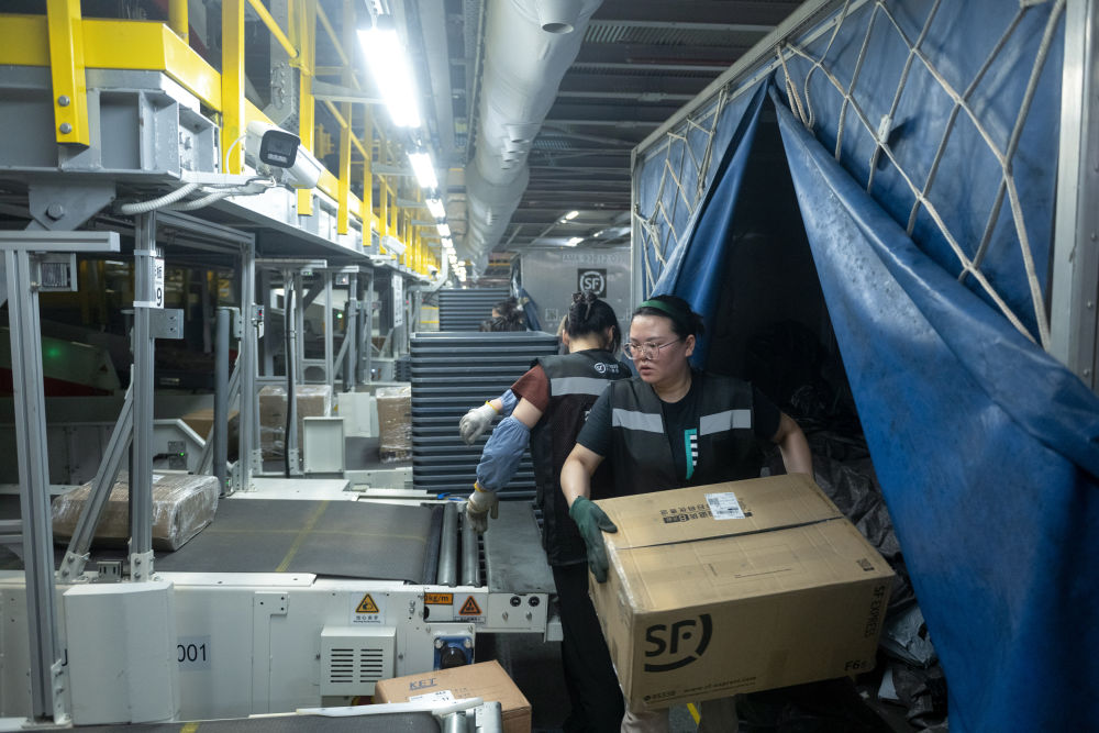 ??2024年5月25日凌晨,工人在湖北鄂州花湖國際機場轉(zhuǎn)運中心進行分揀作業(yè)。新華社記者 肖藝九 攝