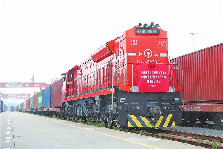 這趟班列踏上的是一條新征程,標(biāo)志著中歐班列(鄭州)南通道“跨兩?!本€路開(kāi)通運(yùn)行。