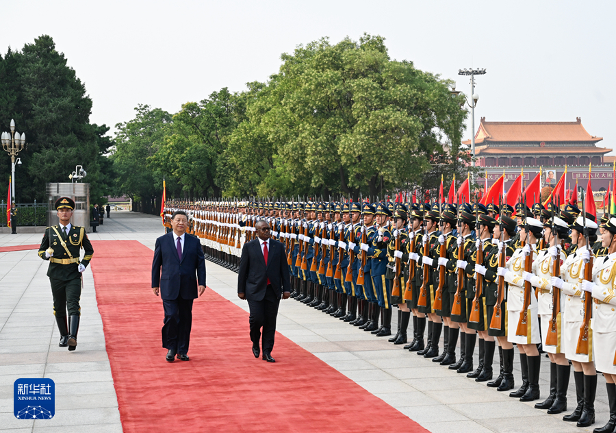 ??恩巴洛抵達(dá)時,禮兵列隊致敬。兩國元首登上檢閱臺,軍樂團奏中國和幾內(nèi)亞比紹兩國國歌,天安門廣場鳴放21響禮炮。恩巴洛在習(xí)近平陪同下檢閱中國人民解放軍儀仗隊,并觀看分列式。
