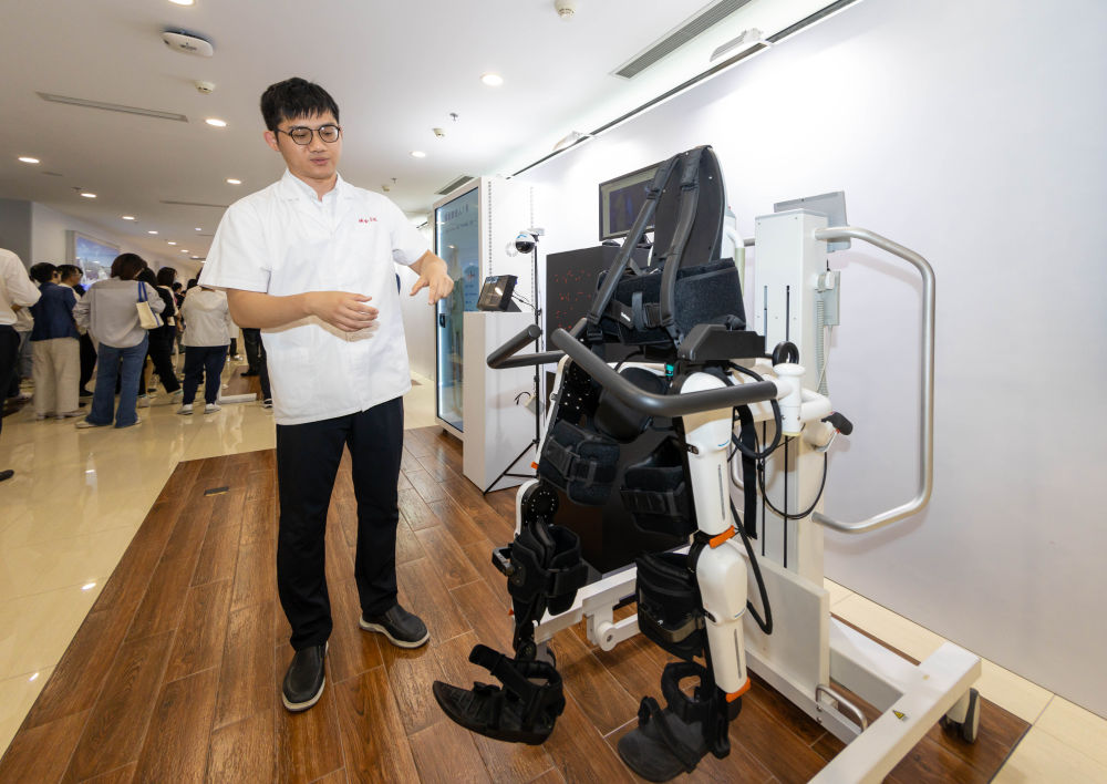 ??2024年5月24日,在位于上海市嘉定區(qū)的上海交通大學(xué)醫(yī)學(xué)院附屬瑞金醫(yī)院腫瘤質(zhì)子中心,工作人員介紹由瑞金醫(yī)院醫(yī)生和醫(yī)療公司共同研發(fā)的用于恢復(fù)患者下肢的醫(yī)療機器人。新華社記者 王翔 攝