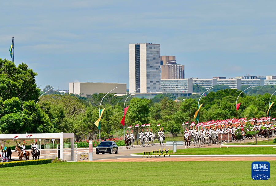 ??初夏時節(jié)的巴西利亞,天朗氣清。黎明宮內(nèi),綠草如茵,450名威武禮兵整齊列隊。在120名龍騎兵護(hù)衛(wèi)下,習(xí)近平乘車抵達(dá)黎明宮前廣場。