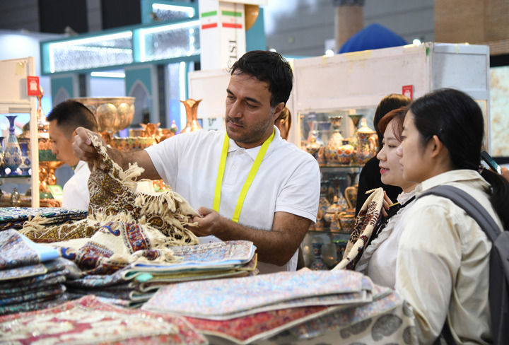 ??2024年9月20日,在陜西省西安市舉行的第八屆絲綢之路國際博覽會上,來自伊朗的參展商(前左一)向觀眾介紹產(chǎn)品。 新華社記者 張博文 攝